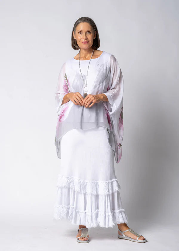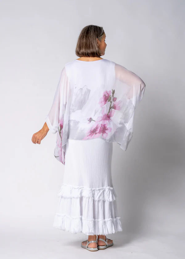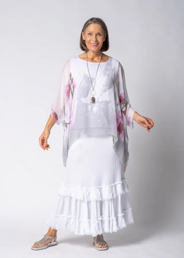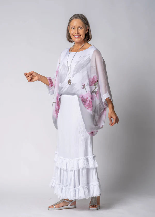 This beautifully designed clothing top features a subtle and enchanting floral print, set against a crisp white base. The gentle, tonal blue florals evoke serene Mediterranean charm. Its flowing shape flatters all body types, while gently shaped sleeves and a relaxed fit ensure modern sophistication and comfort. The Ciara Silk Top in Positano Blue is lightweight, with a silky smooth finish that resists creasing for fuss-free wear throughout the day.