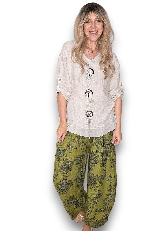 Helga May: Barrel Linen Pants - Olive French Toille