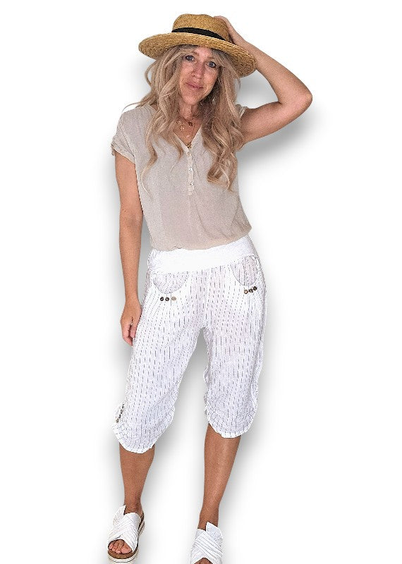Helga May: Linen Capri Pants - White Pinstripe