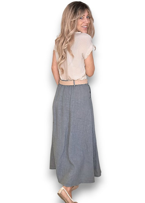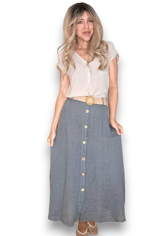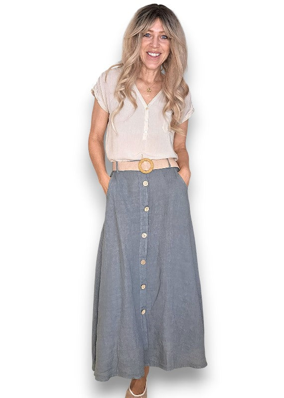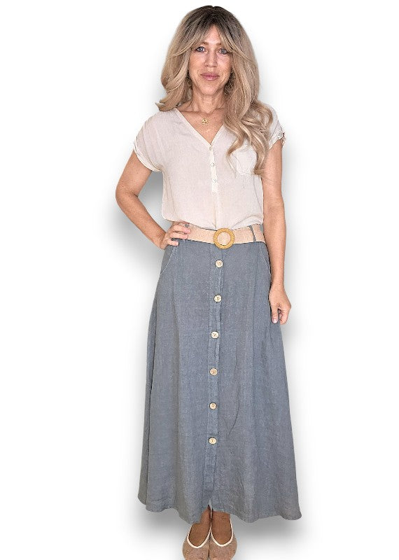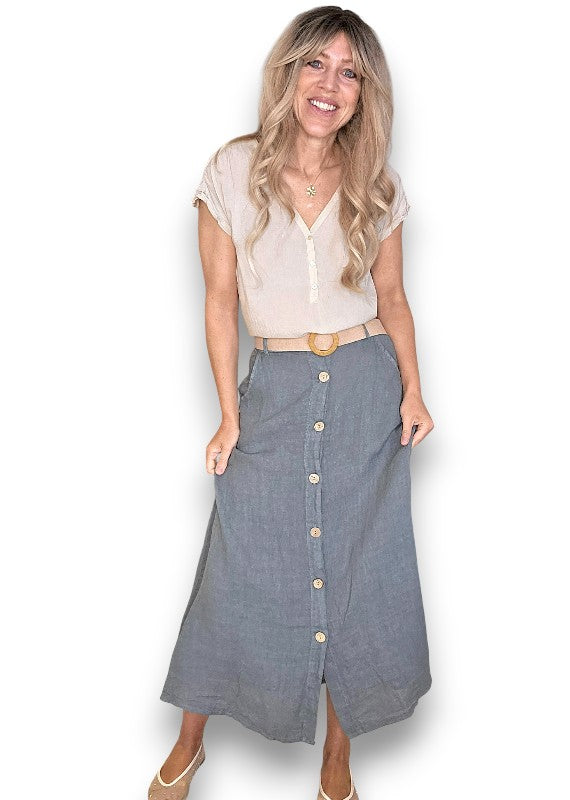 Helga May: Raffia Belt Linen Button Skirt - Grey